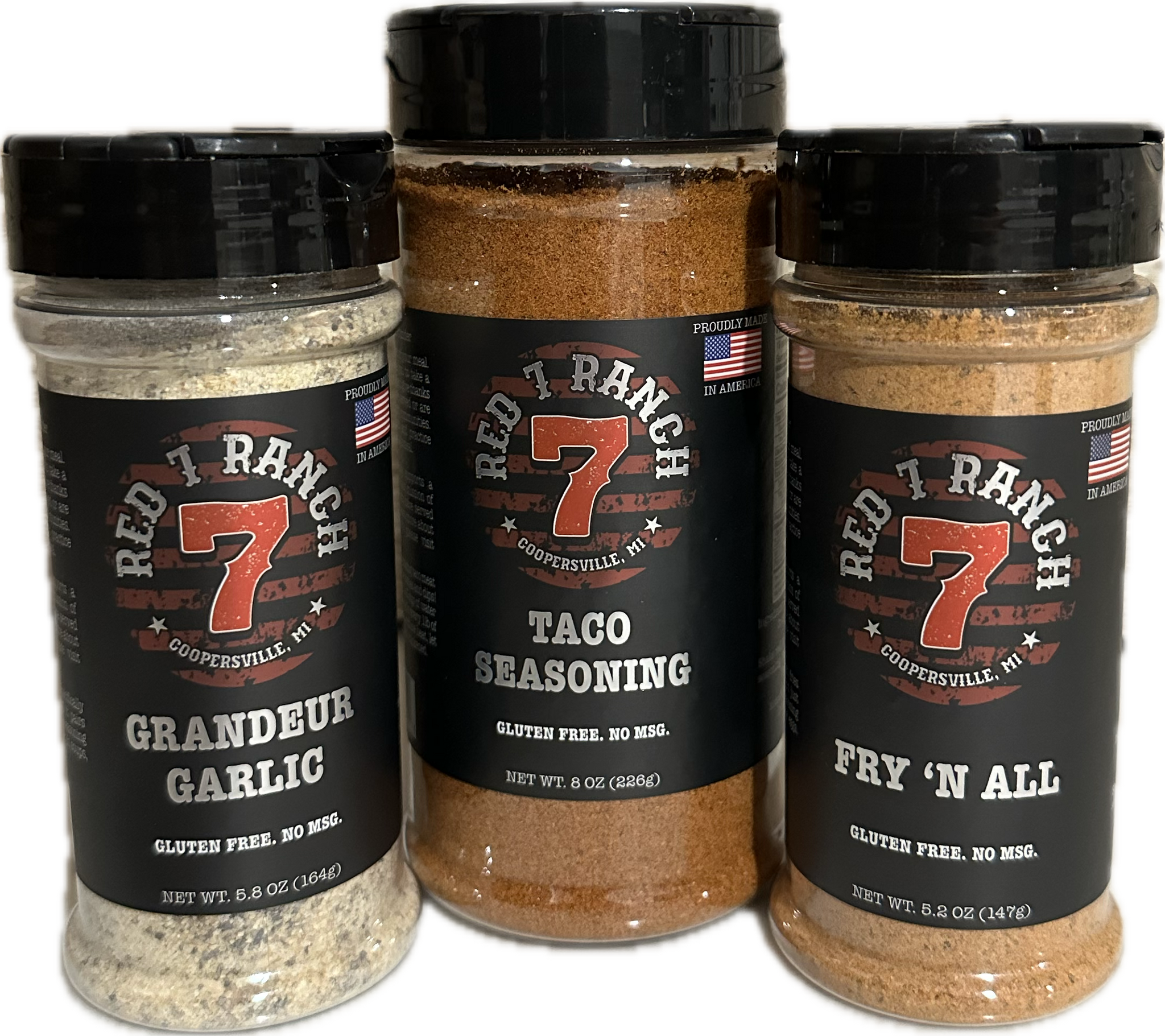 Want to save some money and stock up on some great seasonings to have yourself covered from the grill to the kitchen? Try our Red 7 Ranch Sampler bundle featuring our Grandeur Garlic Seasoning, Fry 'N All Seasoning, and Taco Seasoning.